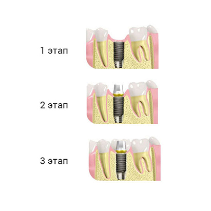 Первый этап — хирургический — вживление импланта непосредственно в челюсть пациента через маленький надрез в десне, который наглухо ушивается в конце операции. Операция проводится под местной анестезией и при грамотном проведении является абсолютно безболезненной. Срок реабилитации после операции 2-3 дня. В дальнейшем имплант никак не ощущается. Срок приживления импланта в среднем 3-6 месяцев.